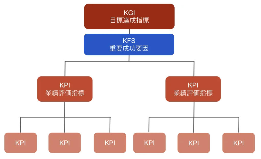 その積み上げで上位のKPIが達成でき、目標の成功要因となる重要項目(KFS)を達成していくことで、最終的に企業の「重要目標達成指標」KGIを達成していきます。