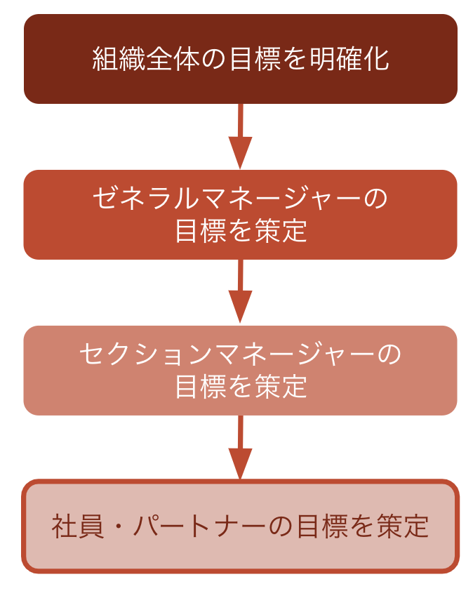 その際に、一人ひとりの個人目標が組織目標達成に貢献できるような、事業ごとの目標に落とし込みます。